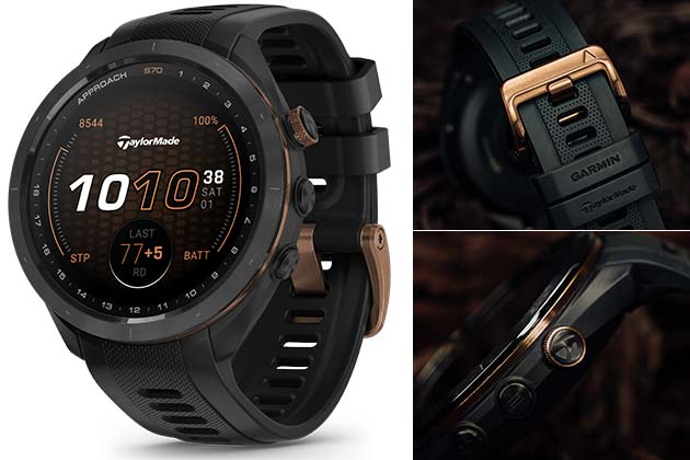 TaylorMade and Garmin combined their passion for golf to create a unique and exclusive TaylorMade-branded Garmin Approach S70. The watch features the TaylorMade “Metal-T” logo on the button crown enclosed by a TaylorMade exclusive copper ring around the bezel with TaylorMade and Garmin markings on the keepers. The watch bands are brought together with a copper clasp.