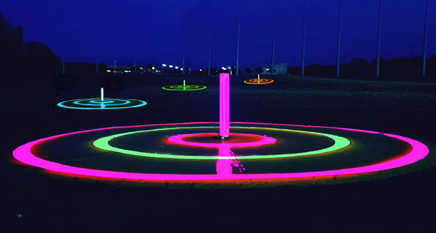 During the day, the targets provide visual end point, like bowling alley pins, to complement the camera tracking and scoring at the hitting bays. At night, the glowing targets respond with programmable light and sounds to create a festive experience for players and spectators.