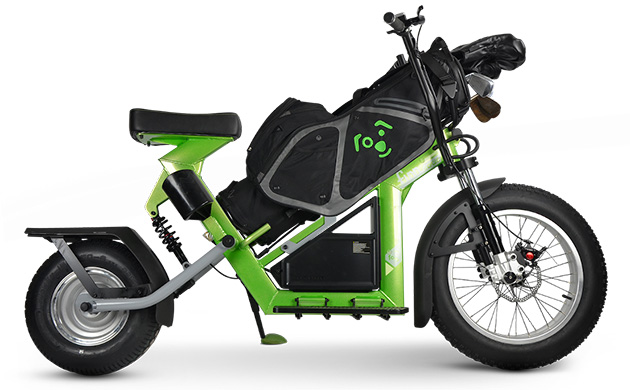 The golf bag sits along the center-line of Finn Scooter offering easy golf club access and riding stability. Finn Scooter has front and rear suspension for a comfortable ride and braking with hand-operated hydraulic disc brakes. The electric motor is in the rear wheel offering a sleek design. The lithium battery can go up to 36-holes on a single charge though charging after every round is suggested.