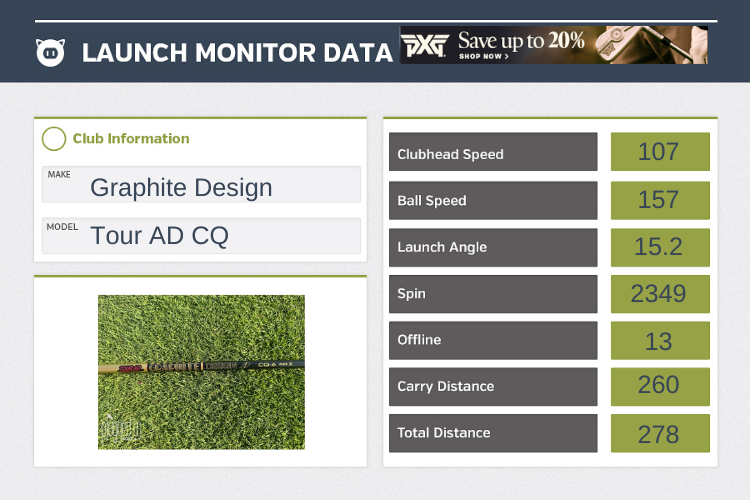 The Graphite Design Tour AD CQ shaft has unreal consistency. Mid-high launch with mid-high spin. Produced a predictable draw. Modest kick.