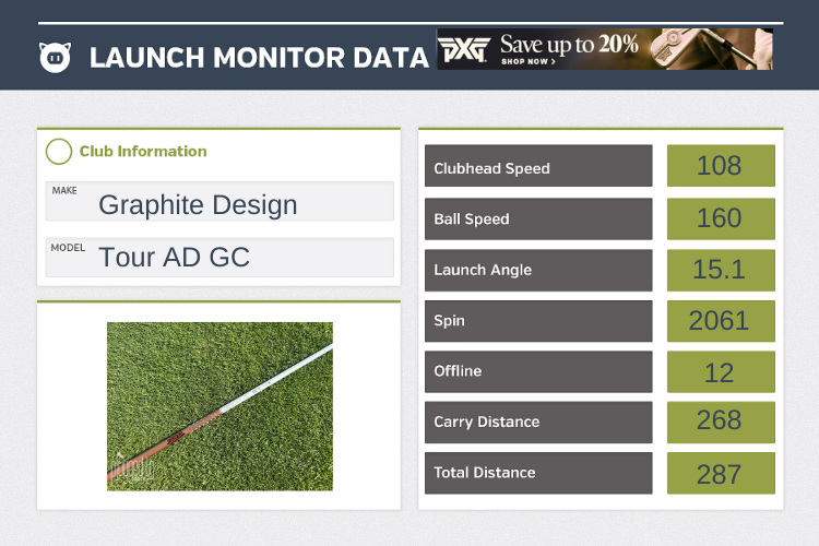 The Graphite Design Tour AD GC shaft has a surprisingly soft and lively feel, but the performance is very consistent. Mid launch and spin. Handles aggressive swings well.
