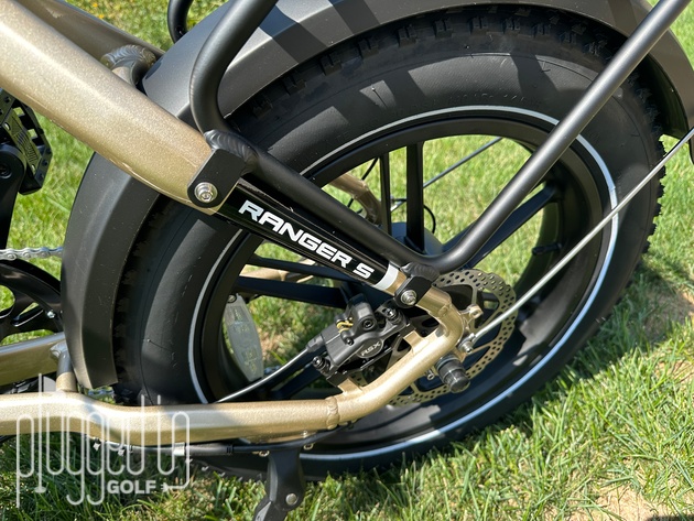 With the Golf Bag Carrier attached, the Ranger S becomes an amazing on-course transport. I set the PAS to 5 and was flying past traditional golf carts. The suspension and fat tires handled all types of terrain easily. The Golf Bag Carrier acts as a super-charged kickstand (see below), so I felt confident parking the Ranger S on all types of slopes.
