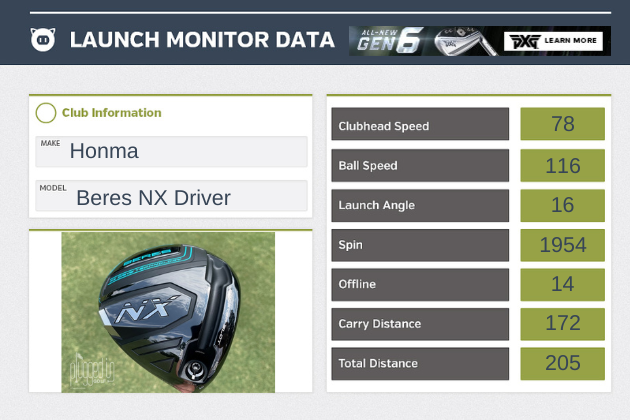Collecting data at Club Champion, I felt like I was swinging pretty well, but a quick glance at my numbers showed my clubhead speed was down.  At home a few hours later, the discomfort in my back confirmed something wasn’t quite right with me.  Despite my shortcomings, the Honma BERES Nx driver performed admirably, chalking up a 1.49 average smash factor.