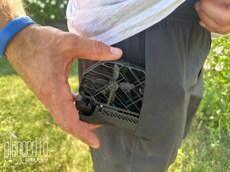 The HOVERAir X1 PROMAX is a pocket-sized drone that can turn your round into a movie.  Very easy to use.  Loads of options.  8K resolution.  Not a great choice for swing analysis.