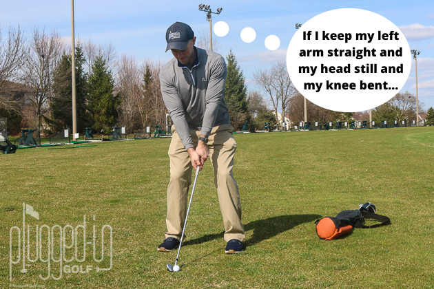 These “simple” cues are best whether you’re working on the basics – not hitting it fat – or dialing in higher level things like shot shape and trajectory.  If you’re trying to control your shot shape, consider putting an alignment stick in the ground a few yards in front of you and thinking, “Start the ball left/right of the stick.”  If you want to tweak your swing path, use some tees to mark your ideal path and think, “Swing over these tees.”