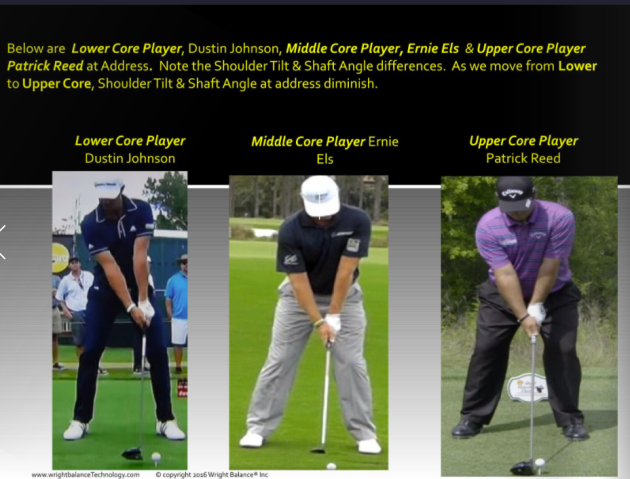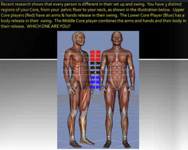 How does this apply to golf? Dr. Wright has found that there are certain swing characteristics that match each core region. If you’re an upper core player, you will exhibit certain tendencies and particular mechanics will fit your body more easily. This covers everything from grip to posture to positions during the swing.