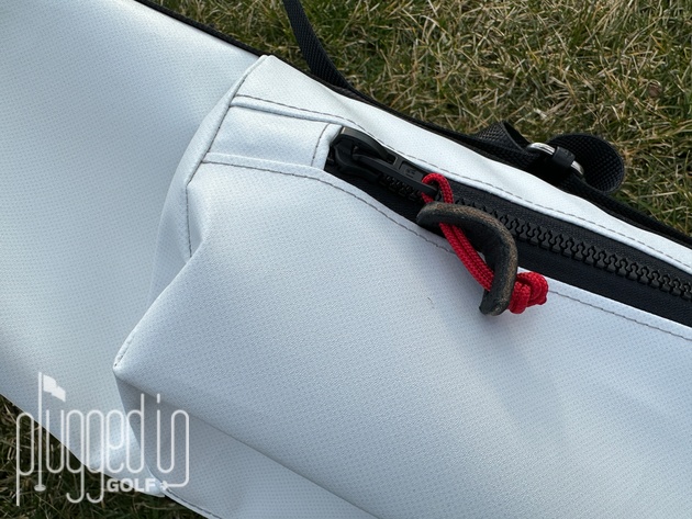 The minimalist approach of Koger comes through from the first glance. This bag is devoid of the giant branding that is typical in golf bags. It’s one solid color – white, beige, light gray, or dark gray – with black accents. The red paracord on the zipper pulls provides the one pop of color, and it’s a wonderful study in how a tiny detail can have a big visual impact.