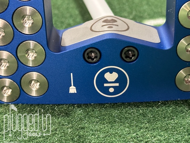 It seems there would be a ton of tweeking before you settle on what you think is the best setup. 16 weight plugs is overly complex in my mind. I’m not sure what the two set screws are for? More complexity. Looking down on the putter I see simplicity but ugly. Ugly simplicity! I play with a centered shafted putter but having the shaft engage the head so far behind the face is an unstable position to start with, but possibly stabilized by the very heavy head.