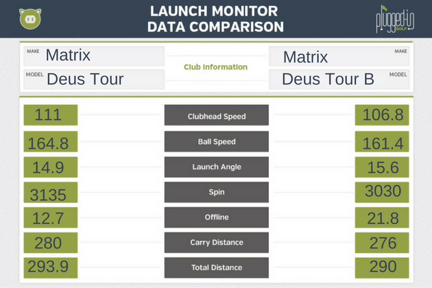 The numbers above show that I hit both Matrix Deus Tour shafts similarly with the exception of speed.  What isn’t shown is that I had a higher smash factor with the Tour B than I did with the Deus Tour.  The smash factor paired with the slightly lower spin was enough to get similar distance to the Deus Tour.  As mentioned before, I had to dial back my swing a bit to achieve those numbers with the Tour B.