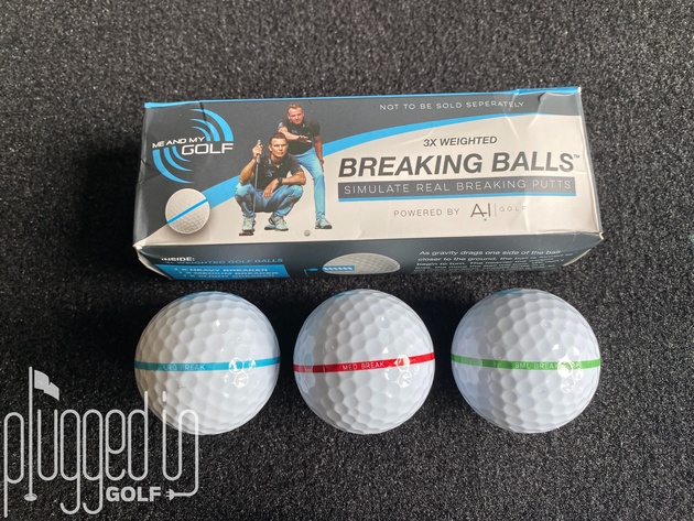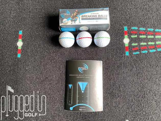The other main component of this kit is the sleeve of breaking balls. Each of the three balls is designed to break a different amount. The color of the balls aligns with the colors on the mat, showing you where to aim to “make” the putt with break.