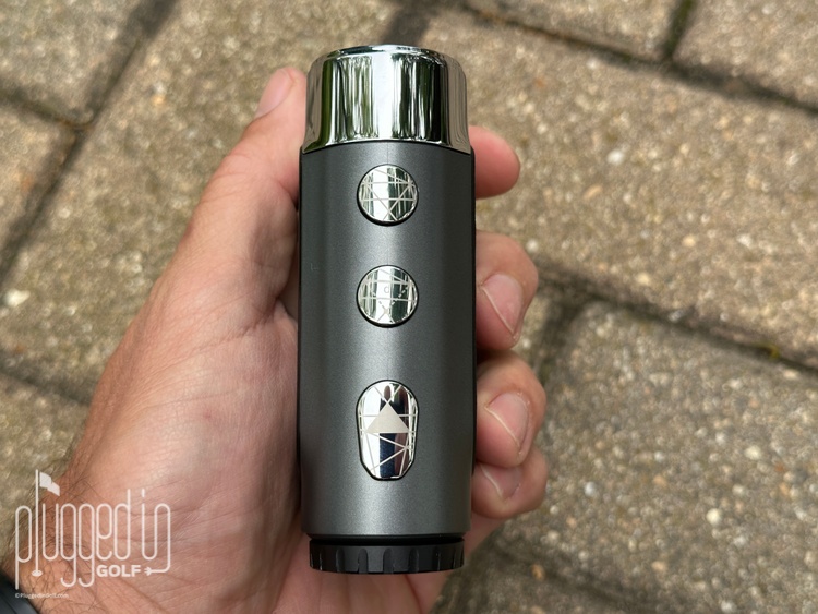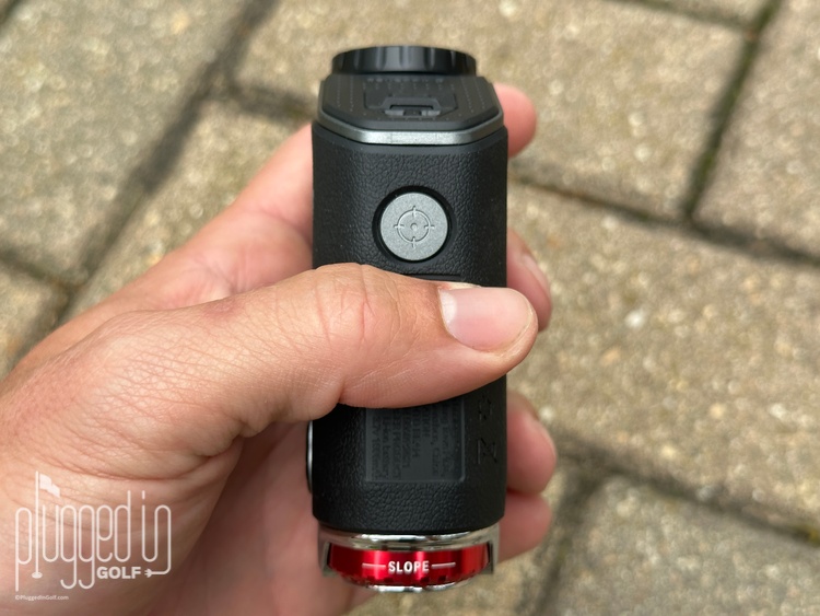 The basic rangefinder functions of the GenePro G1 aren’t too different from most others. The large button nearest your eye turns the rangefinder on and gets your distances. You can switch between Flag Lock and Ball-to-Pin modes with a single push of the farthest and middle buttons, respectively. The slope adjustment is toggled with a ring underneath the lens. Finally, holding down the farthest button allows you to adjust the brightness, rain & fog mode, vibrations, and units.