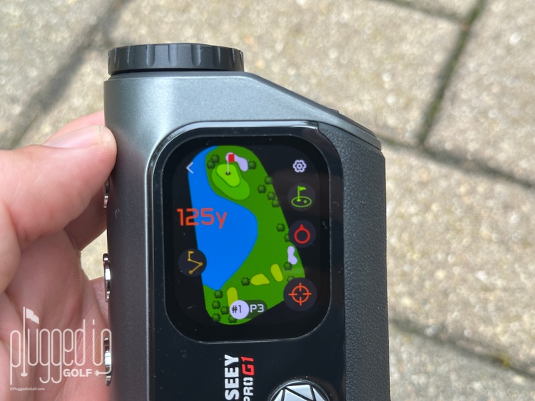 Operating the Mileseey GenePro G1 rangefinder’s GPS is done through the touchscreen on the side. When you get to the course, tap the golf ball icon to activate the GPS. Select the course you’re playing, and, from there, it will operate like most GPS units. Out of the box, the GenePro G1 has over 43,000 courses mapped, so you shouldn’t have any issues finding your track. There are some options you can toggle, and a scorekeeping/shot tracking mode, but the basics are straightforward.