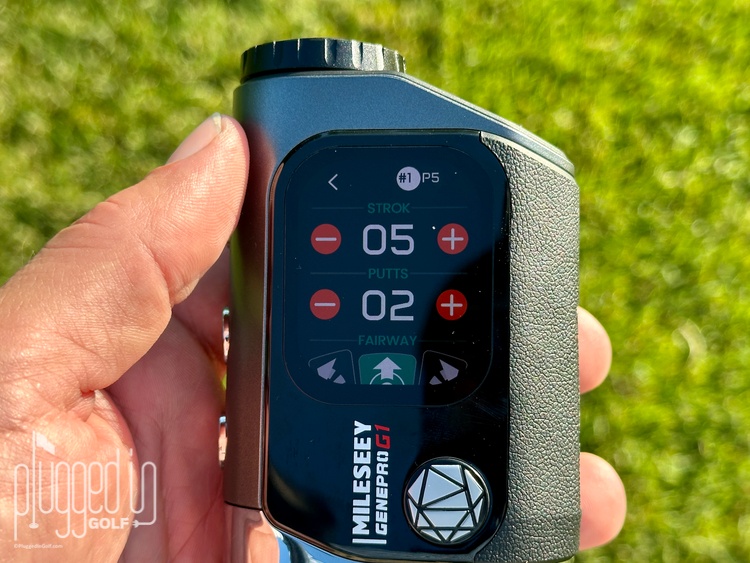 Mileseey really went over the top by adding scorekeeping and shot tracking to the GenePro G1. While we’ve seen this in other GPS units, it’s a new frontier for a GPS/rangefinder combo. As you can see above, the scorekeeping tracks total strokes, putts, and tee shot accuracy. You can also shot track using the touchscreen or the button on the bottom of the G1.