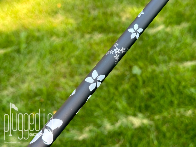 The Mitsubishi Diamana BB shaft brings back all the classic elements of the original Diamana line with its own twist. Just below the grip, the flowerband wraps around the shaft in white and silver on a matte black background. The traditional Diamana surfboard logo sits between the flowerband and the BB designation.