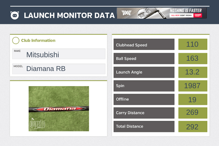 The Mitsubishi Diamana RB is billed as having Mid+ launch with Mid spin, compared to Low/Low in the Diamana WB [review HERE] and Mid/Mid for the BB. In a refreshing turn, Mitsubishi actually puts numbers to the difference between the RB and BB, stating that on average the RB launched 2 degrees higher with 200 RPM more spin.