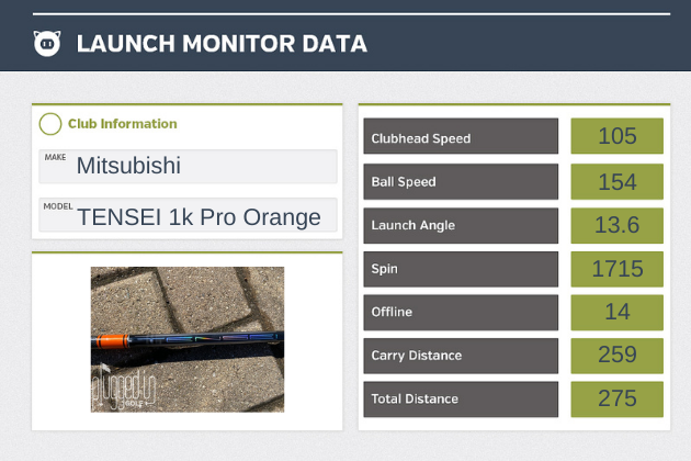 The Mitsubishi TENSEI 1K Pro Orange has a very similar profile to the low launch, low spin TENSEI 1K White [review HERE]. It’s very stable in the tip but smooth through the butt section. This provides the exact feel that I want in a shaft – a little “action” or kick with great stability at impact.
