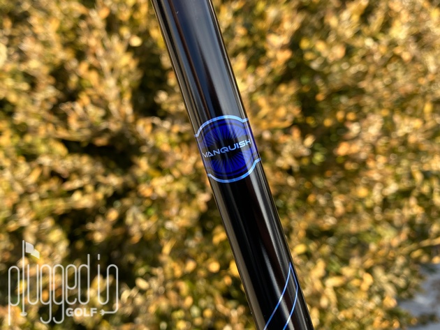 Speaking of which, the Vanquish doesn’t have a traditional “logo up” side. One side does have more graphics, but both sides are packed with visual interest. On one side, you get a smaller Vanquish logo in an iridescent grey/blue color that I don’t think I’ve ever seen before. That’s where you also get the shaft’s specs and the Mitsubishi Chemical logo. On the other side, the Vanquish logo is larger, but it’s just outlined in that aforementioned iridescent shade. It’s much more subtle this way for players who don’t want much distraction at address.