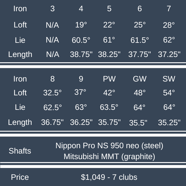 All that ball speed is paired with mid launch and mid-low spin to generate massive distance. The lofts are slightly stronger than the JPX923 Hot Metals which were, predictably, stronger than the JPX921 Hot Metal irons [review HERE]. For me, this creates landing angles that are too shallow as early as the 6I. Additionally, there are just three degrees between clubs from the 4I to 7I, which may create poor distance gapping for players without above average speed.