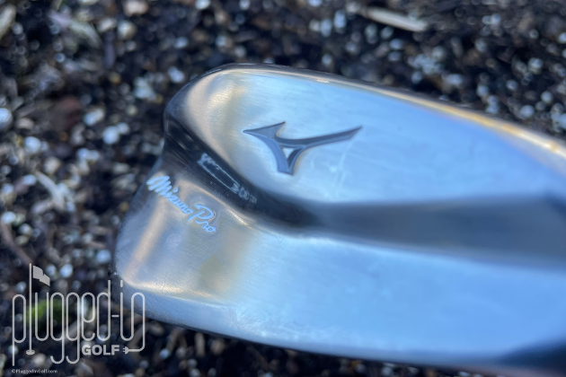 In the bag, the Mizuno 241 irons has a one piece brushed steel look to them with no breaks in the clubhead and minimal stamping on the back. The Mizuno logo sits atop the triangular shape that frames the rear of the club while “Mizuno Pro” is embossed near the toe. The simple design without any color fill gives it a classic, timeless look. The only color fill on the head is in the white iron number out on the toe which is what we have traditionally seen from Mizuno.