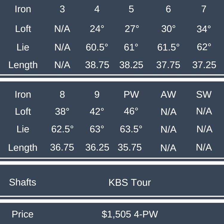 These irons have some of the most traditional – read: weakest – lofts that you’ll find. Despite that, the ball speed on center is excellent. It does drop off steeply when you miss the sweet spot, but you’ll get ample distance on pure strikes. The traditional lofts also produce higher spin and launch, though this is balanced by the higher CG compared to larger irons.