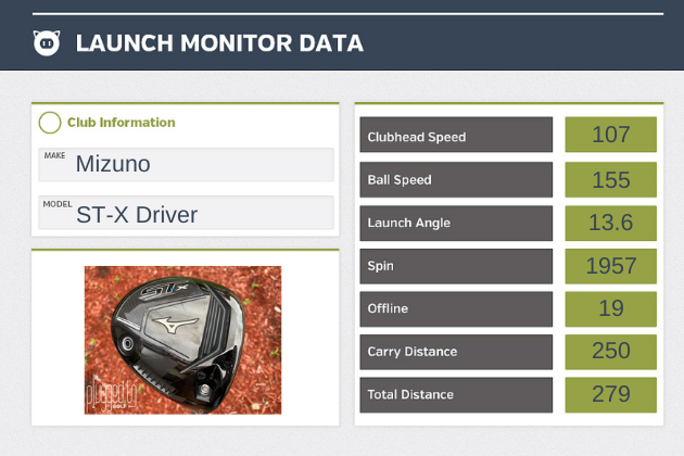 The Mizuno ST-X driver has a noticeable draw bias. Good feel on center; feedback on mishits is jarring. Forgiveness is underwhelming.