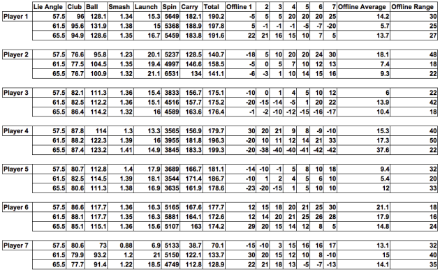 Looking at our testers’ shot patterns, there were significant changes as we moved across lie angles. Some players would stripe all seven shots at one angle, then hit thin and fat shots with another. Players who were painting the center line with a flat lie angle were all over the map with an upright one.