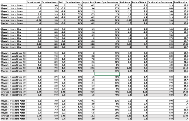 If we look exclusively at the SuperStroke 5.0 – the biggest grip in the test – the evidence looks pretty weak. It’s middling in every measure of consistency: face angle, club path, impact location, and rotation. However, if we include the jumbo Scotty Cameron grip, the big putter grips look pretty good. Focusing on the group averages, the jumbo Scotty was #1 in every consistency metric. It was also the leader in median in 3/4 categories.