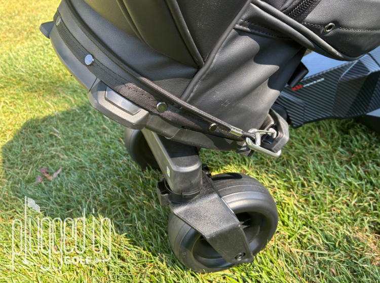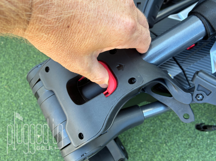 Once charged, the cart opens with one press of a large red button. Again, without the “Happy Card,” I would’ve been lost on this part as there are a few tricks to unfold each lever. My golf bag loaded easily in the lower section with a carabiner strap for the base. The top section had a harder time as my stand bag’s legs didn’t quite fit flush between the slot brackets (as seen with a lot of modern push carts). It was still well secured with the cart straps, but using a cart bag is the best fit for the NAVEE Birdie 3X Electric Golf Cart.