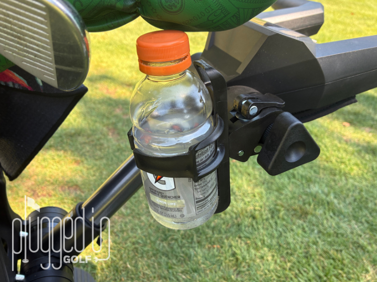 For accessories, just forward of the operating screen are two attachment ports. These attachments house an included umbrella holder and drink holder. NAVEE does offer a phone holder accessory as a separate purchase. If you want additional storage, you’ll need to find aftermarket pieces or use your bag’s storage pockets. Lastly, there is a handy USB-C charging port right next to the speed control buttons so I could charge the cart’s remote, my phone, or other electronic if needed during a round.