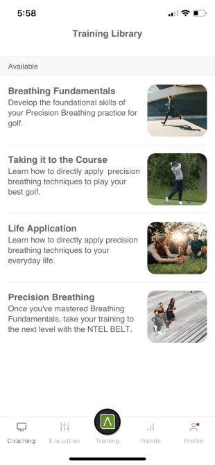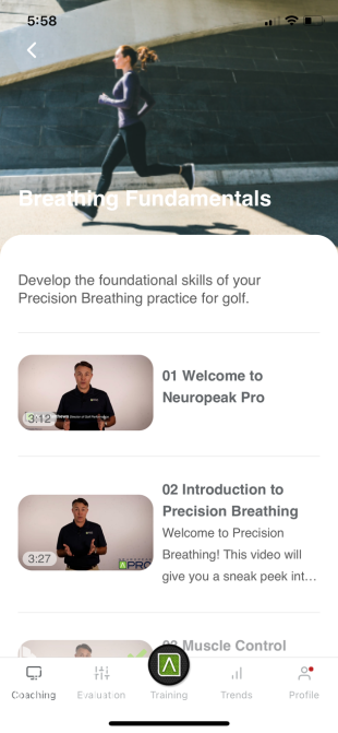 Inside the app, you’ll find tabs for Coaching, Evaluation, Training, Trends, and Profile. It’s recommended that you start with the Coaching-Breathing Fundamentals videos. There are six videos in this series, most around 3-4 minutes. I like that the app allows you to train while you watch the videos. There are also video series on Taking it to the Course, Life Application, and Precision Breathing.