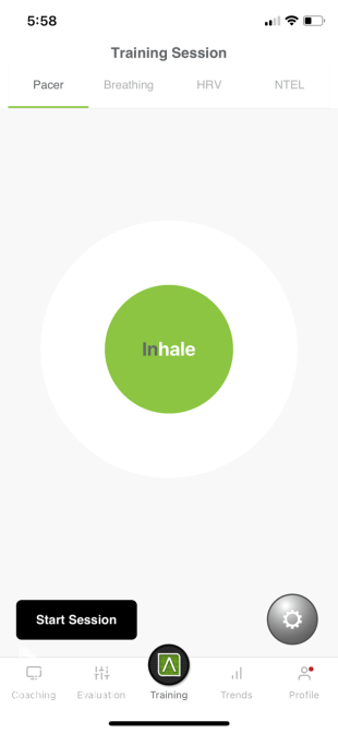 Let’s start with what a training session looks like. You tap the “Training” button which brings up the screen on the right, above. Tap “Start Session” and the green ball expands and contracts to cue your breathing. There is no maximum or minimum training time, but NeuroPeak Pro suggests sixty minutes of training per week, spread over five days. If you’re using the NTEL Belt, each training produces stats on your Heart Rate Variability and Breathing Structure.
