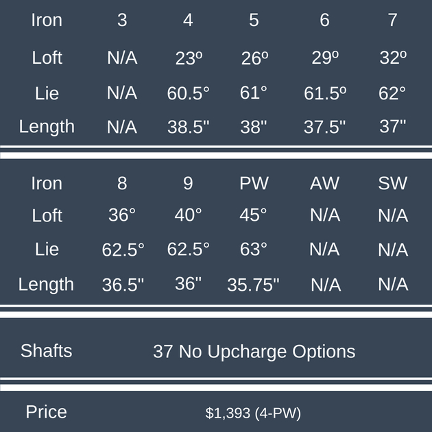 New Level Golf irons are available from a growing network of club fitters and also through their website. New Level is setting the bar extremely high when it comes to custom offerings with 37 no upcharge shafts from the likes of KBS, True Temper, Nippon, Steelfiber, Accra, and Fujikura. You can also choose from 9 different grips. They offer guidance on club and shaft selection via their fitting form HERE.