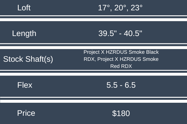 The massive benefit of any New Level club is that the direct to consumer model allows for tons of custom options at a lower price. Their hybrid comes in three different lofts – 17 degrees, 20 degrees, and 23 degrees. The weights are also customizable – 4, 8, 12, and 16 grams. Project X HZRDUS is the no upcharge stock shaft. For a nominal fee, there are plenty of other shafts available. You can even choose to do it yourself and order the head alone. You can purchase the hybrid with all the customizations for $180, but at the time of this writing, it is on sale for $165.