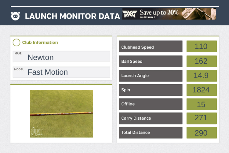 Changing to the seven dot Newton Fast Motion*, I found some things I expected and one that I didn’t. Predictably, the spin ticked down a little bit, and the dispersion stayed respectable. I really liked how it was able to control the results of my intentional draw swing. What surprised me is that this shaft still wanted a measure of self-control in transition. I did not get the best results from swinging 100%. There was a level just below – call it a restrained 95% – where this shaft was absolute dynamite: higher speeds, high launch, low spin, laser straight. It wasn’t a swing I could call on every time, but the results were worth chasing.