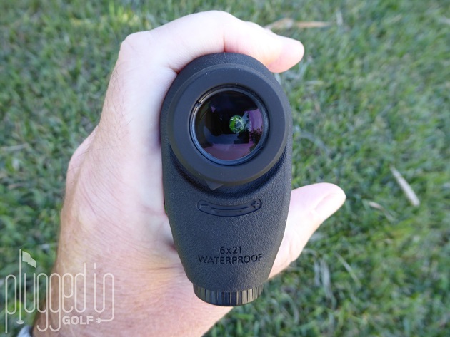 Insert the included CR2 battery and the Nikon COOLSHOT PROII STABILIZED is good to go right out of the box. The rangefinder comes pre-set in the Golf Mode (more on that momentarily) with distances in yards. If you’ve ever used a laser rangefinder, operation is intuitive. The button closest to your eye and under your index finger turns on the unit and locks in your target. Twisting the eyepiece allows you to adjust focus.