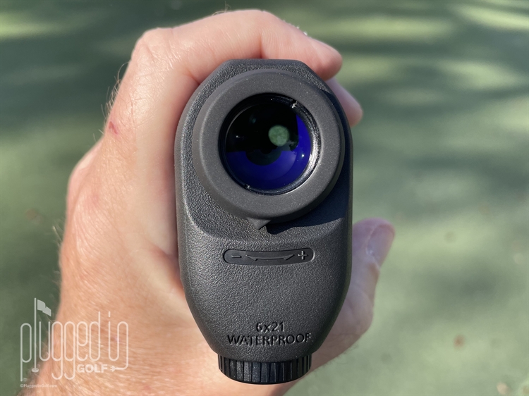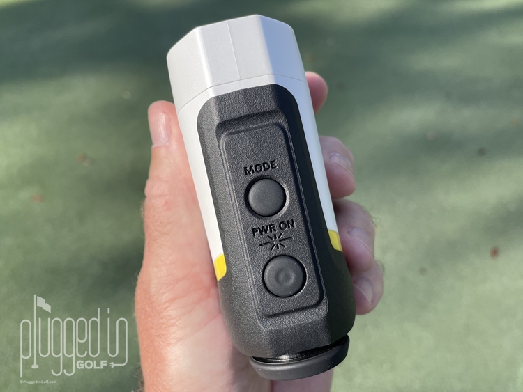 In the fairly nondescript box, I found the rangefinder, case, CR2 battery, and Quick Start Guide. The Nikon COOLSHOT PROIII STABILIZED rangefinder’s default settings should be perfect for most golfers, making the unit ready to go right after installing the battery. The PWR ON button closest to your eye and under your index finger is really all you need to engage with to achieve distance measurements.