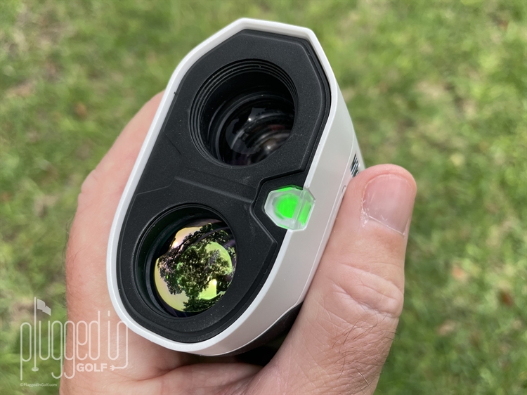 Briefly pressing the MODE button toggles between four distance measurement modes – Golf Mode with actual and slope adjusted distance, actual distance mode (for tournament play), actual distance plus height mode, and horizontal distance plus height mode. I’d love to meet the elite golfer or caddie that engages those last two modes. When the Nikon COOLSHOT PROIII STABILIZED rangefinder is in the actual distance mode a flashing green light on the front left of the unit offers visual confirmation to officials and other players that slope is off. It’s worth getting familiar with the corresponding display of the preferred mode as it’s easy to move off it – like when your cart mate grabs the unit and starts hitting buttons.