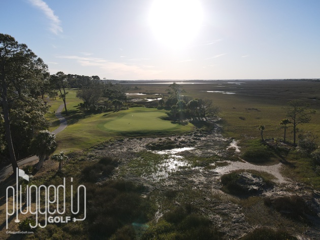 This looks like a mid-length par 3 on the card, but it plays much longer thanks to the prevailing wind. Try not to be distracted by the beautiful views and make sure to get your ball on the green. The marsh comes up fairly close to the front edge of the putting surface, so being short is not the play.