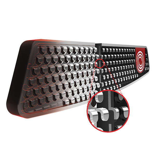 There are different theories about how a ball is supposed to come off the putter face. Most companies are striving to get the ball rolling end-over-end as fast as possible. Odyssey‘s Microhinge face has little hinges on it that help the ball roll with immediate topspin.