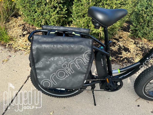 The Oraimo Trcker 100 e-bike retails for $999 through Amazon. You can support Plugged In Golf by buying it with THIS LINK. For an additional $100, you can add the saddle bags shown above, which are great for running errands.