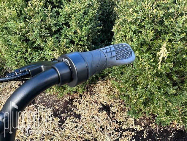 The controls on the Oraimo Trcker 100 e-bike are pared down compared to those on the HeyBike Ranger S [review HERE]. On the left hand side (above), there’s a power button, battery life indicator, and speed control. On the right hand (below), there’s a twist grip throttle. There’s no fancy display, but you can see the key information – your “gear” and the battery life – at a glance.