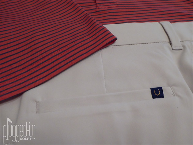 The Vickery Performance Shorts, 95% polyester and 5% spandex, are also lightweight and dried quickly. The Oxford script in the waistband has gription to keep your shirt tucked in and the rear right pocket is button free for easily slipping a glove or scorecard in and out. This is picky, but the small interior coin pocket in the front right pocket is a bit too roomy. It captured everything I dropped in the pocket, including the golf ball.