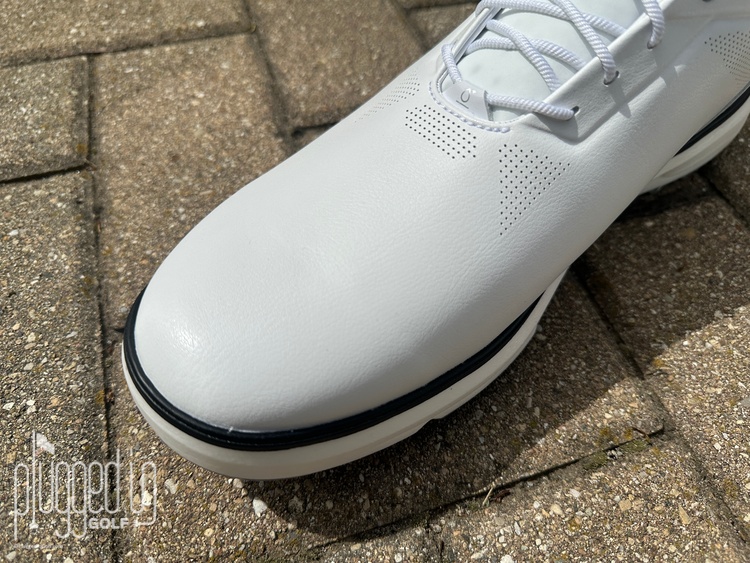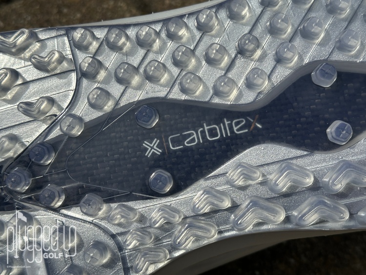 The other key performance element in the sole is the Carbitex Directional Carbon Fiber Propulsion Plate. This plate is designed to help golfers create more speed by returning more energy from the ground. You can see this technology in many high end running shoes, and it’s becoming increasingly common in golf shoes. Just as carbon plates won’t turn a novice runner into Eliud Kipchoge, these shoes won’t turn a bunter into Rory McIlroy, but it will help you to get everything you can out of your swing. What I like about PAYNTR’s carbon plate is that it provides rigidity during the swing without being uncomfortably stiff when walking.