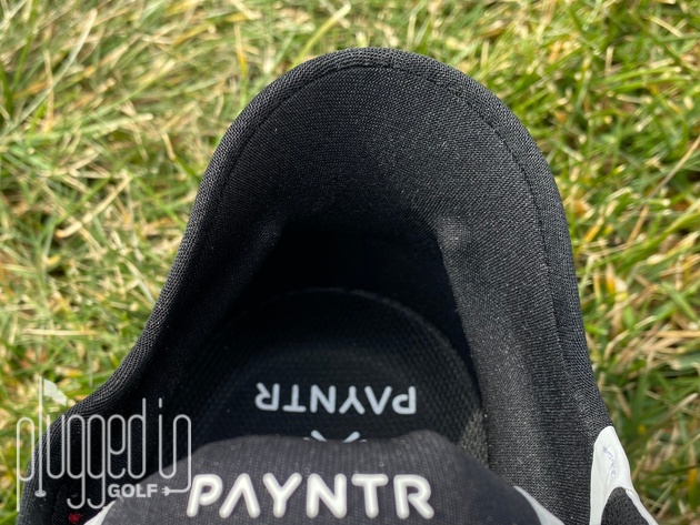 If you’re anything like me, your first question upon seeing these shoes was, “What is going on with that heel?” According to Payntr, this is a “blister free PMX-Fit heel,” the first of its kind in a golf shoe, and the first shoe I’ve encountered with a blister free warranty. Practically speaking, this design replaces a “normal” heel with a material that’s softer and more flexible for increased comfort. The top of the heel also arches away from you Achilles to prevent chafing. Your foot is further isolated from the rubbing by the pads in the heel (above) that nudge your foot forward.