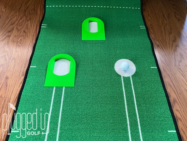 The photo above shows the Putting Mat in use with the Pelz Player Putting Cups [review HERE].  I liked using these trainers together because I enjoyed the cup capturing the ball, and it gave me the ability to raise the difficulty by shrinking the cup.  The negative side of using the cups is that you won’t see how far past the hole your putt would have gone.
