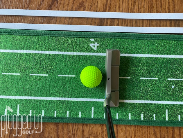 The Perfect Practice Roll-A-Putt provides golfers with an 8-foot putting surface that ramps up to a 3″ hole. It’s essentially the right half of the Perfect Practice mat with its extensive alignment markings and smaller cup.