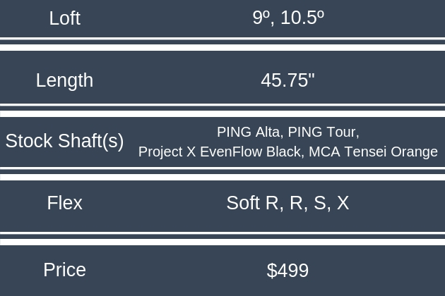 As has become their custom, PING offers a variety of shaft options with the G410 LST driver. The PING branded options are the low spinning PING Tour 65 and 75 as well as the high launching Alta CB Red 55. If you prefer something from the aftermarket, the MCA Tensei CK Orange 60 (review HERE) and Project X EvenFlow Black 75 (review HERE) are available, too.