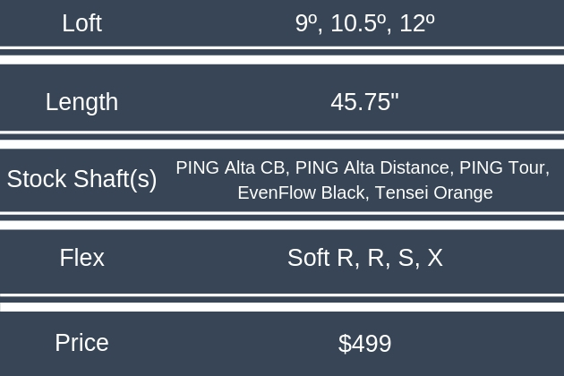 Finally, PING has five stock shaft options available at no upcharge. The Alta CB Red 55 is a proprietary counter-balanced shaft that’s lightweight and high launching. PING also has a low launching stock option in the PING Tour. If you prefer something with an aftermarket vibe, you can choose between the EvenFlow Black and MCA Tensei Orange.