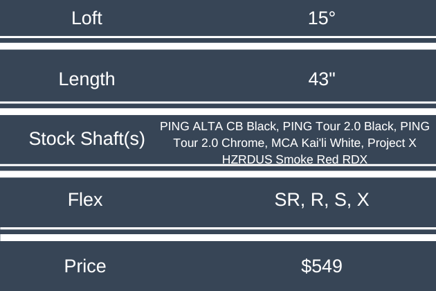 The PING G430 LST fairway wood is only available in a 15 degree 3 wood. It is adjustable +/- 1 or 1.5 degrees and has settings to change the lie angle +/- 1 degree. It is available with several PING-engineered shafts, the ALTA CB Black, Tour 2.0 Black, and Tour 2.0 Chrome, as well as two aftermarket shafts. I tested it with the ALTA CB, and I think it played a big role in how well we got along. It’s a little bit lighter than other shafts and is a great fit for players with smooth tempo.