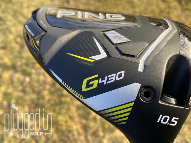 The sole of the G430 SFT driver is dominated by geometric designs and a large, white “PING” across the center. Small slashes of yellow at the toe and heel and the adjustable weight are the primary differences between this and the G425.